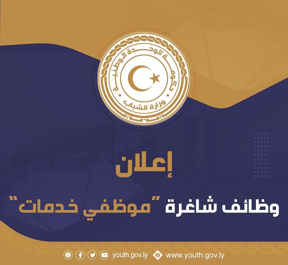 تعلن وزارة الشباب بحكومة الوحدة الوطنية عن حاجتها لعدد من الموظفين الشباب بقسم الخدمات بديوان الوزارة بالعاصمة الليبية طرابلس، ويشترط أن يكون المتقدم:
