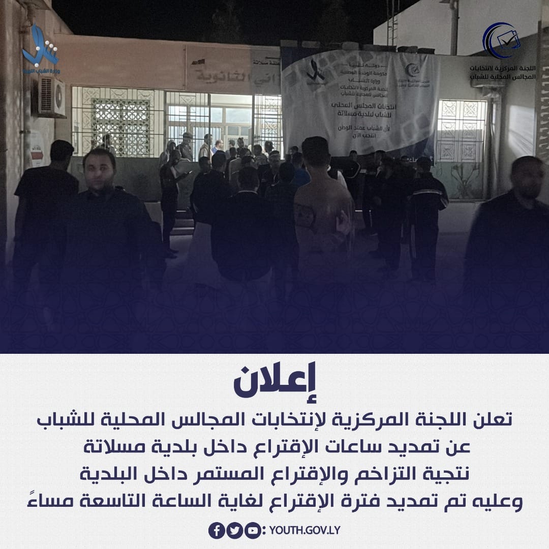 تعلن اللجنة المركزية لإنتخابات المجالس المحلية للشباب عن تمديد ساعات الاقتراع داخل بلدية مسلاتة نتيجة التزاحم والإقتراع المستمر داخل البلدية وعليه تم تمديد فترة الاقتراع لغاية الساعة التاسعة مساءً