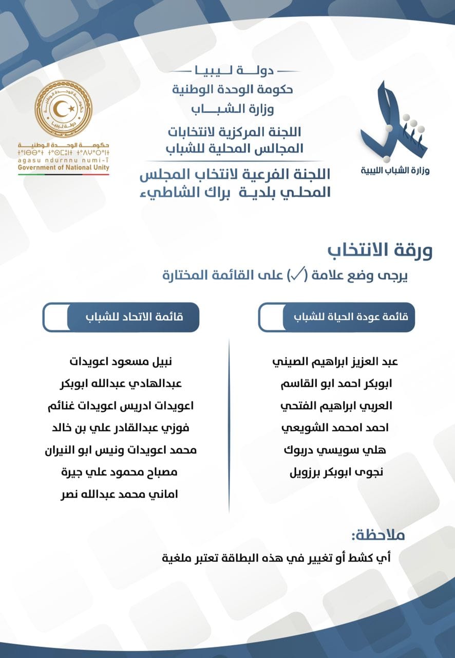 قوائم المترشحين لانتخابات المجلس المحلي للشباب ببلدية براك الشاطيء والتي ستجرى يوم الغد السبت 15 أكتوبر 2022م.