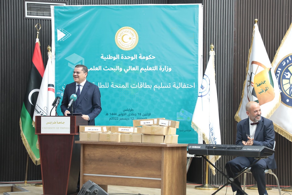 أشرف دولة رئيس مجلس الوزراء المهندس عبدالحميد الدبيبة مساء اليوم الاثنين الموافق 12 ديسمبر 2022م على مراسم تسليم بطاقات المنحة الطلابية التي نظمتها وزارة التعليم العالي بجامعة طرابلس، بمشاركة وزير الشباب السيد “فتح الله الزني” ووزير التعليم العالي والبحث العلمي الدكتور “عمران القيب” ووزير الدولة لشؤون مجلس الوزراء ورئيس الحكومة السيد “عادل جمعة”، وعدد من السادة رؤساء الجامعات الليبية ومدراء مكاتب التسجيل بالجامعات، ورئيس الاتحاد العام لطلبة ليبيا ورؤساء النقابات الطلابية بعموم الجامعات الليبية، وعدد من الطلبة المستفيدين من المنحة من مختلف الجامعات.