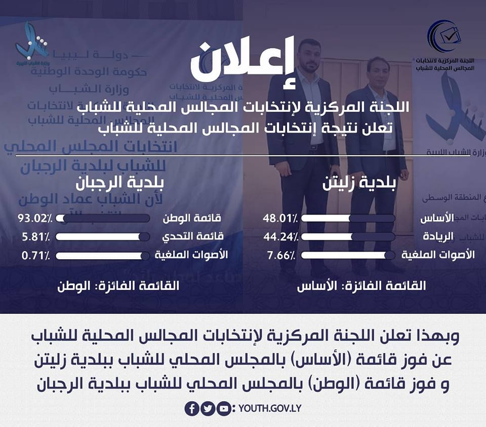 وبهذا تعلن اللجنة المركزية لإنتخابات المجالس المحلية للشباب عن فوز قائمة “الأساس” بالمجلس المحلي للشباب ببلدية “زليتن”