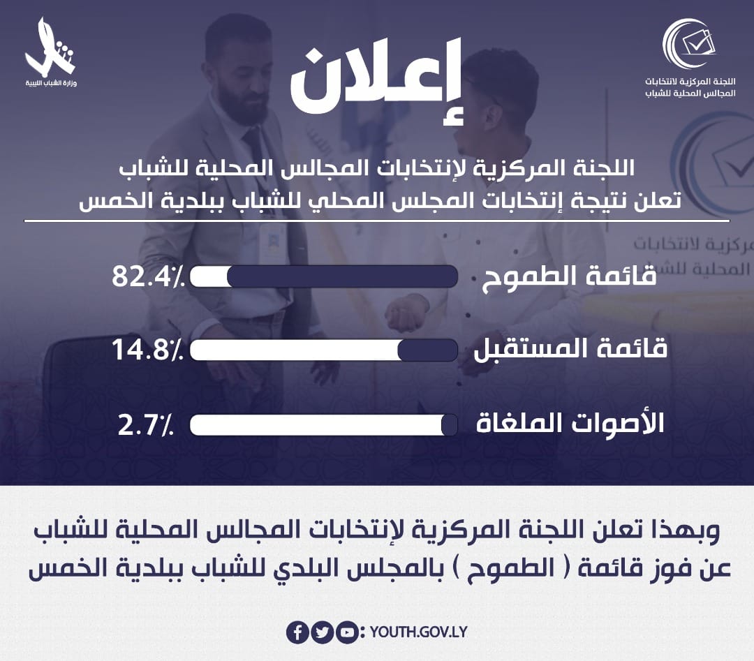 وبهذا تعلن اللجنة المركزية لإنتخابات المجالس المحلية للشباب عن فوز قائمة “الطموح” بالمجلس المحلي للشباب ببلدية “الخمس”