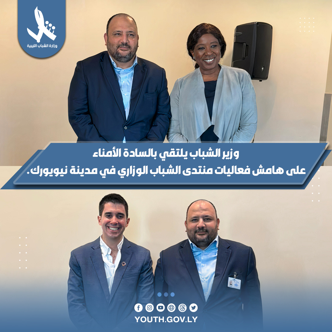 التقى وزير الشباب السيد فتح الله الزني مساء اليوم الثلاثاء الموافق 16 أبريل 2024م بالأمين العام المساعد لشؤون الشباب بالأمم المتحدة السيد فيليب بوليير، و نائب مدير صندوق الأمم المتحدة للسكان (UNFPA) السيدة دين كيتا، على هامش فعاليات اليوم الأول من منتدى الشباب الوزاري التابع للمجلس الاقتصادي والإجتماعي لسنة 2024م والمنعقد في مقر الأمم المتحدة بمدينة نيويورك الأمريكية.