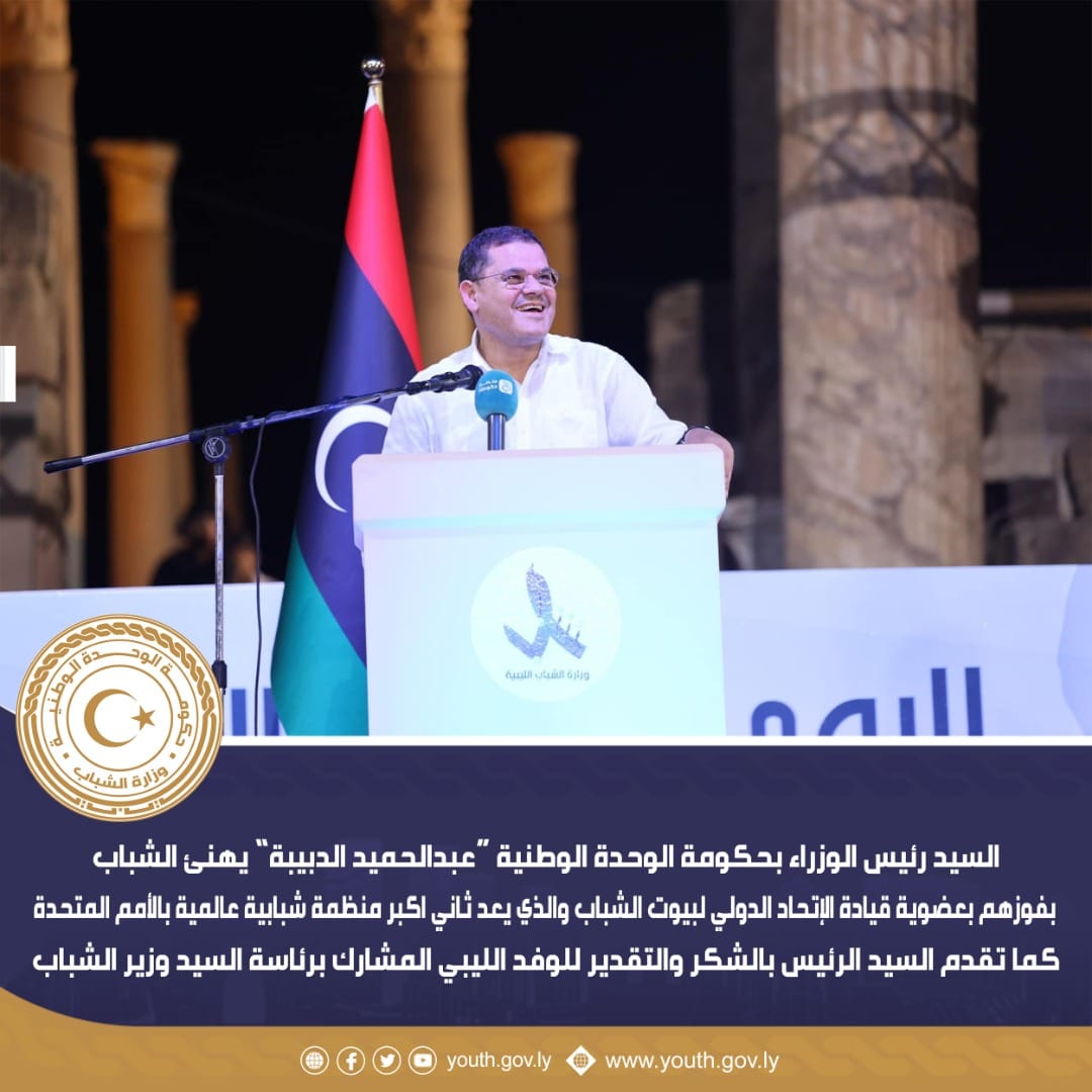 السيد رئيس الوزراء بحكومة الوحدة الوطنية “عبدالحميد الدبيبة” يهنئ الشباب بفوزهم بقيادة الاتحاد الدولي لحركة بيوت الشباب والذي يعد ثاني اكبر منظمة شبابية عالمية بالأمم المتحدة