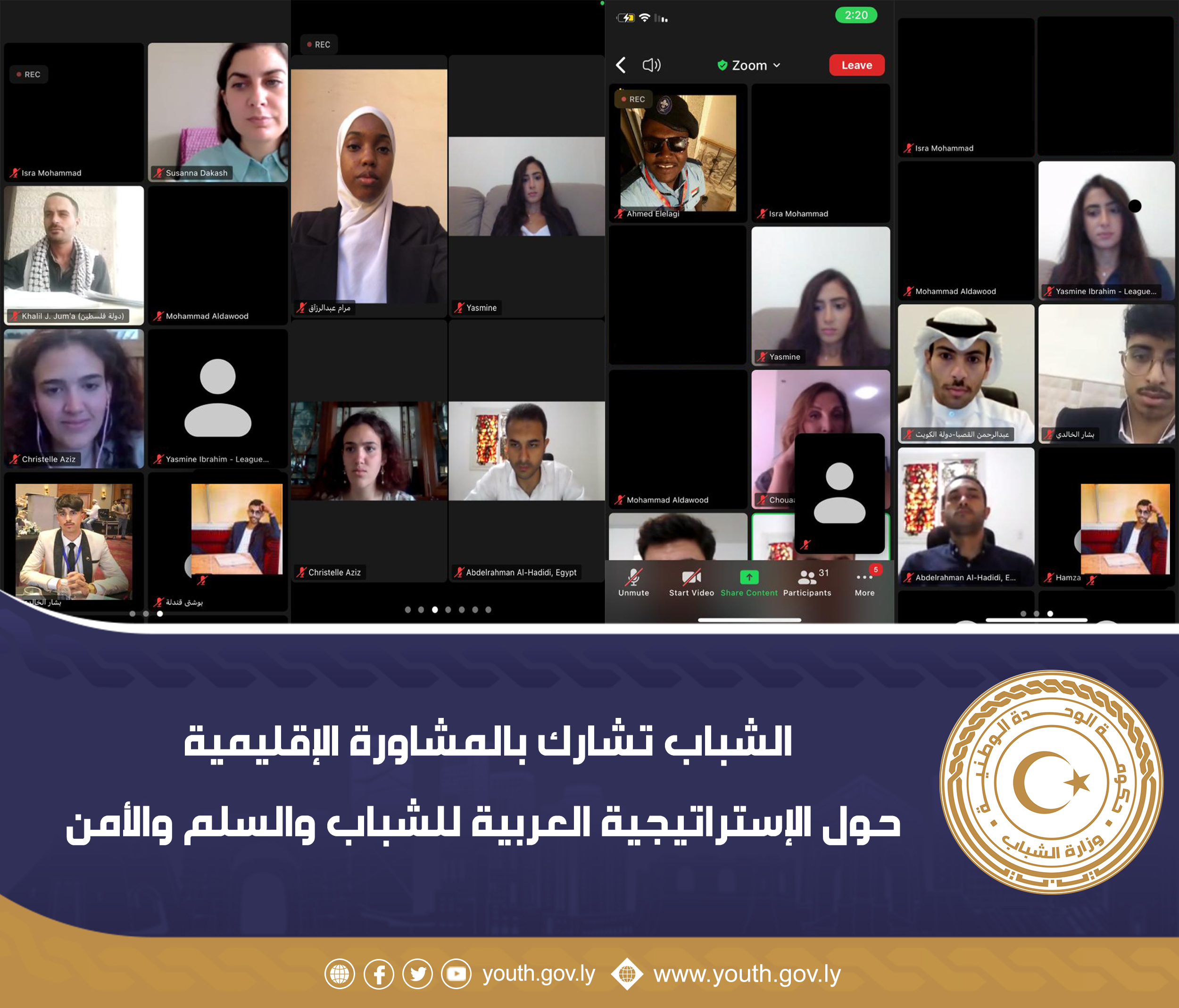 تعزيزاً لأدوار الشباب الليبي على المستوى الإقليمي، شارك الشاب “حسام الدين عبدالفتاح الشفط” والشابة “مرام عبدالرزاق صالح” ممثلين للدولة الليبية بالمشاورة الإقليمية حول الاستراتيجية العربية للشباب والسلم والأمن والتي تجري جلساتها عبر الواقع الافتراضي وتستمر لأيام 23-25 سبتمبر 2022م و تهدف لإشراك الشباب في صياغة القرار ووضع الاستراتيجية العربية للشباب والسلم والأمن بمشاركة عديد الشباب من الدول الأعضاء بجامعة الدول العربية.