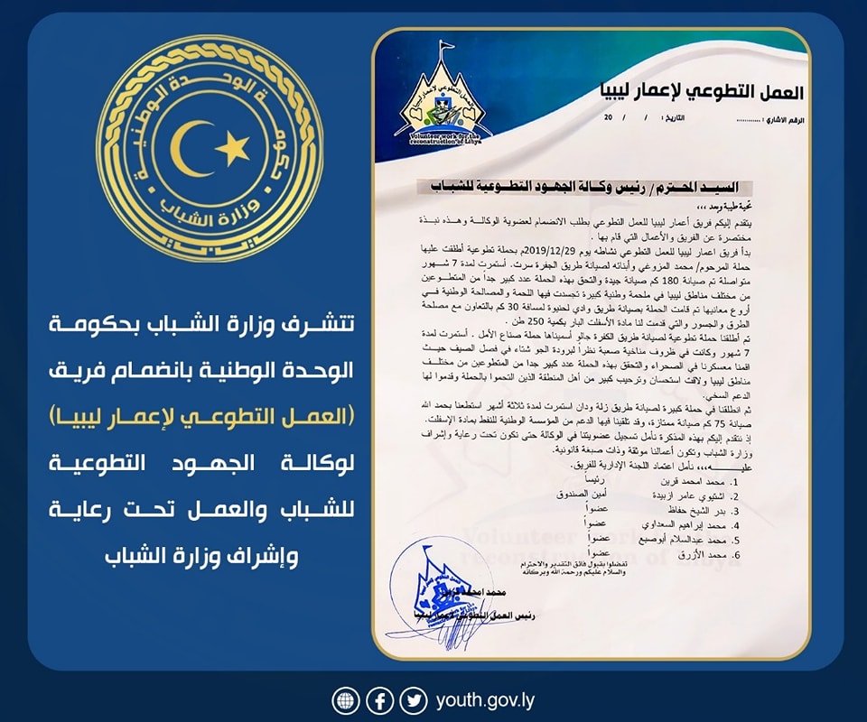 تتشرف وزارة الشباب بحكومة الوحدة الوطنية بانضمام فريق (العمل التطوعي لإعمار ليبيا) لوكالة الجهود التطوعية للشباب والعمل تحت رعاية وإشراف وزارة الشباب.