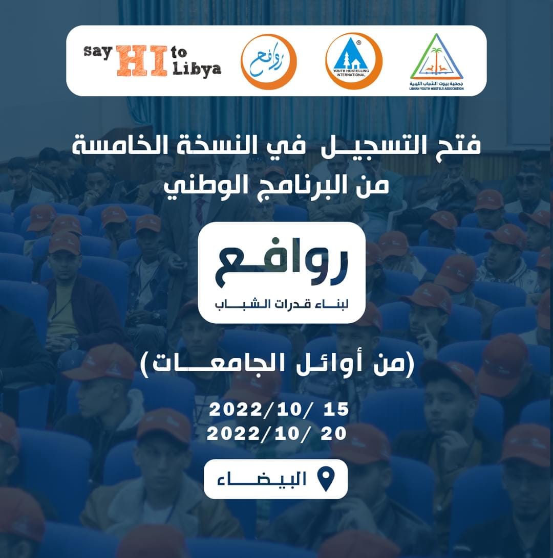 تطلق جمعية بيوت الشباب الليبية مشروع روافع في مرحلته الخامسة والذي يستهدف النجباء الأوائل من خريجي الجامعات للسنوات الثلاث الماضية، حيث يهدف البرنامج لتجويد مهاراتهم ، ويعد من يجتازه منتسباً وعضواً عاملا بجمعية بيوت الشباب الليبية.