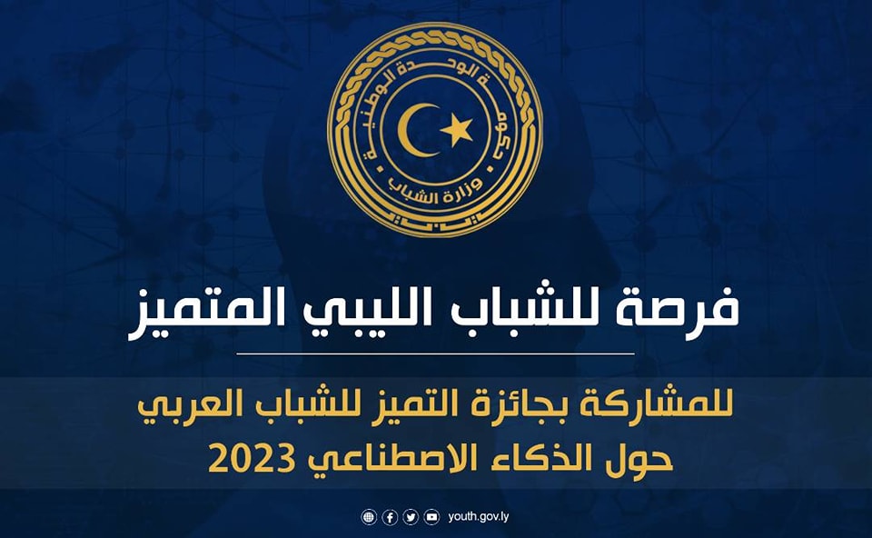 تعزيزاً لأدوار الشباب الليبي على الصعيد العربي، تعلن وزارة الشباب بحكومة الوحدة الوطنية عن فرصة للشباب الليبي المتميز للمشاركة بجائزة التميز للشباب العربي 2023 حول الذكاء الاصطناعي والتي تهدف إلى تحقيق الريادة بمجالات الذكاء الاصطناعي وتحفيز الشباب العربي المتميز ومشاركة قصص نجاحهم، وتحقيق التنمية المستدامة.