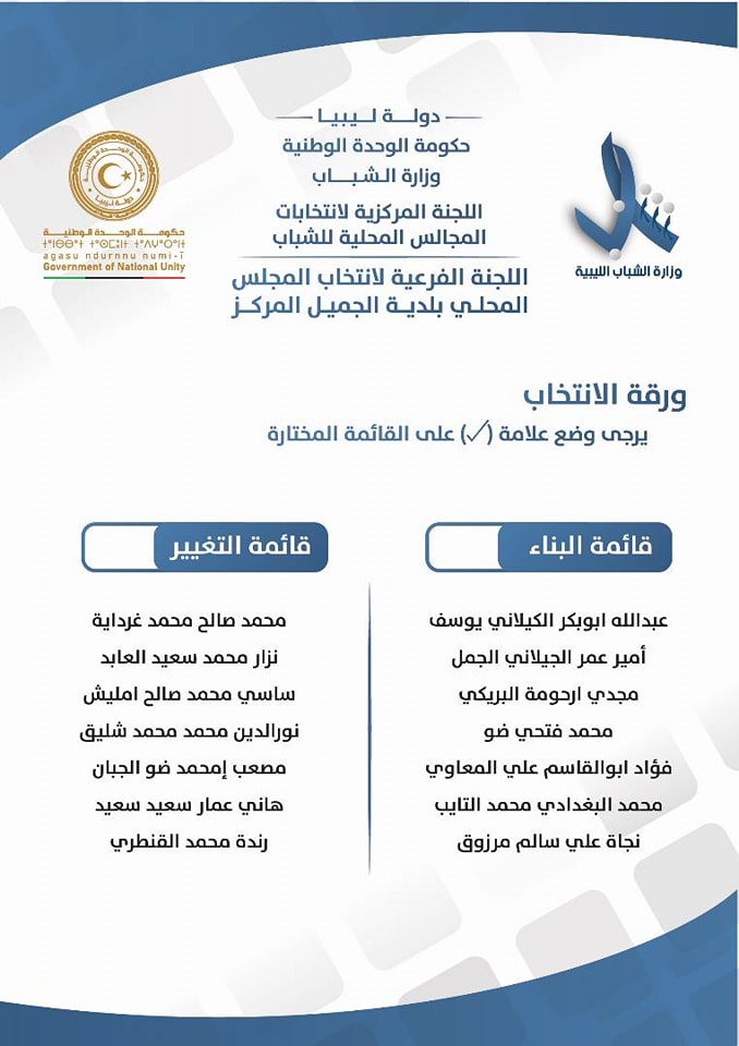 قوائم المترشحين لانتخابات المجلس المحلي للشباب ببلدية الجميل والتي ستجرى يوم الغد السبت 8 أكتوبر 2022م.
