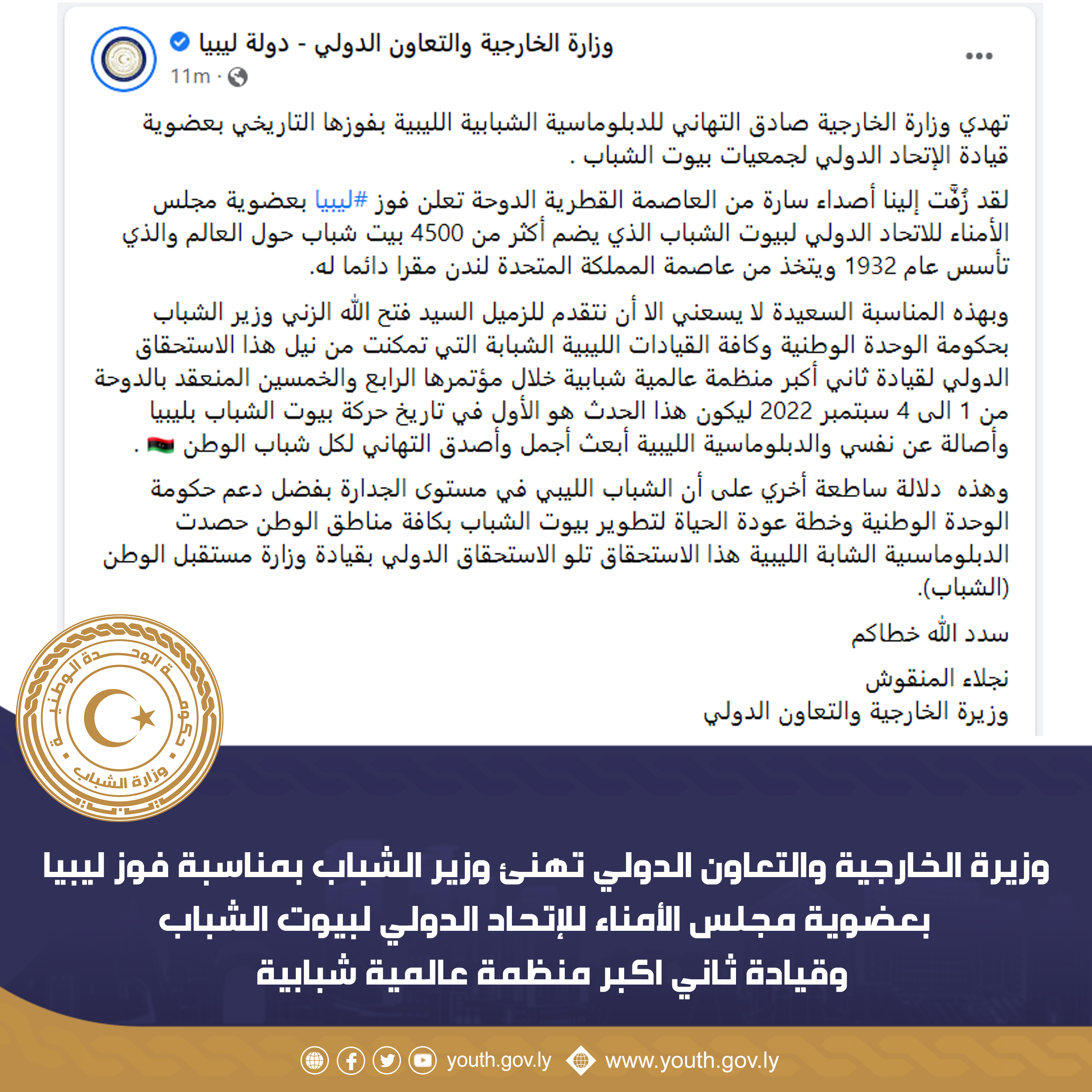 السيدة وزيرة الخارجية والتعاون الدولي بحكومة الوحدة الوطنية والعاملون بالوزارة يهنئون السيد وزير الشباب والعاملين بالوزارة والمؤسسات والمنظمات الشبابية بمناسبة فوز ليبيا بعضوية قيادة ثاني أكبر منظمة شبابية عالمية في الأمم المتحدة