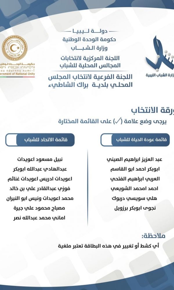 قوائم المترشحين لانتخابات المجلس المحلي للشباب ببلدية براك الشاطيء
