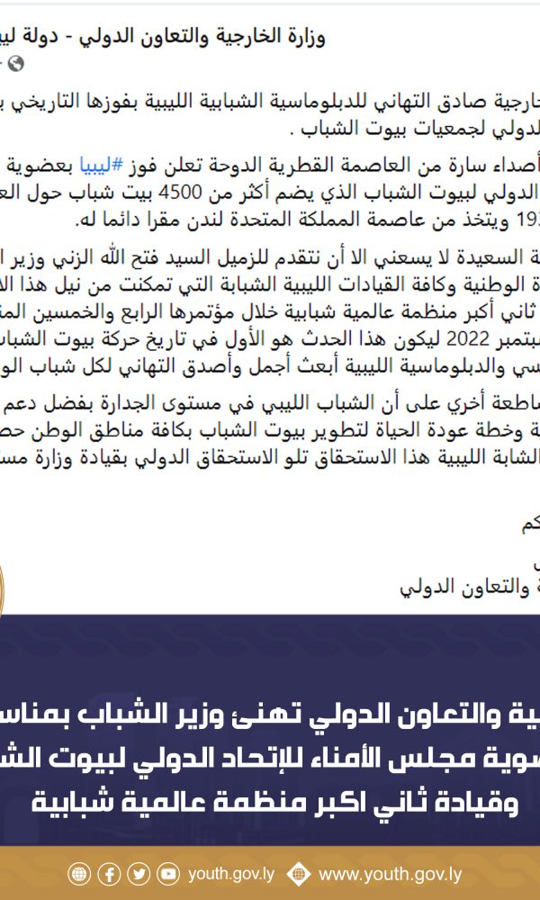 وزيرة الخارجية والتعاون الدولي تهنئ وزير الشباب بفوز ليبيا بعضوية قيادة ثاني اكبر منظمة شبابيةAsimسبتمبر 7, 2022